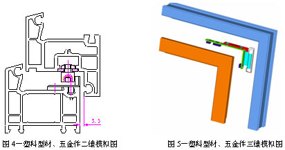 三维模拟即构成门窗的型材、五金件、玻璃等做成三维图形,利用三维软件的功能进行三维组装模拟。其优点是立体感强,能够在组装过程中直接检查零件的干涉现象。如图5所示的是一个三维模拟情况。但三维模拟也有缺陷,一是对安装后变形的产品如胶条等无法进行识别,既使可行也特别复杂,这部分还是要靠试验得出结论。二是三维模拟较复杂,对人员素质水平要求高,计算机配置要求也较高。对一般企业采用二维模拟设计即可。