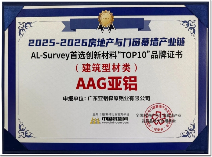 本次评选由行业权威机构主办,依托AL‑Survey 年度调研体系,汇聚产业链权威专家、头部房企、幕墙及门窗企业等多方评审力量,围绕产品质量、技术创新、服务能力、品牌口碑、市场应用等核心维度开展综合评审。评选过程专业严谨、结果权威公正,既是衡量企业综合实力与行业首选度的重要标尺,也是市场采购、品牌选型的权威参考风向标。AAG亚铝凭借强劲综合实力再度上榜,成功蝉联并入库房地产与门窗幕墙产业链AL‑Survey 首选创新材料“TOP10”品牌。这一荣誉,是市场与行业对AAG亚铝长期深耕主业、坚持技术创新、持续领跑行业的高度认可与权威肯定。