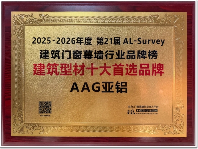 多项荣誉加身,既是行业对AAG亚铝综合实力的高度认可,更是对品牌责任的鞭策。未来,AAG亚铝将以荣誉为动力,稳步进取、笃行不怠,坚守创新与绿色发展理念,积极响应铝产业高质量发展要求,发挥头部品牌引领作用,助力铝加工行业规范健康发展,树立行业品牌形象典范,为建筑产业现代化贡献亚铝力量。