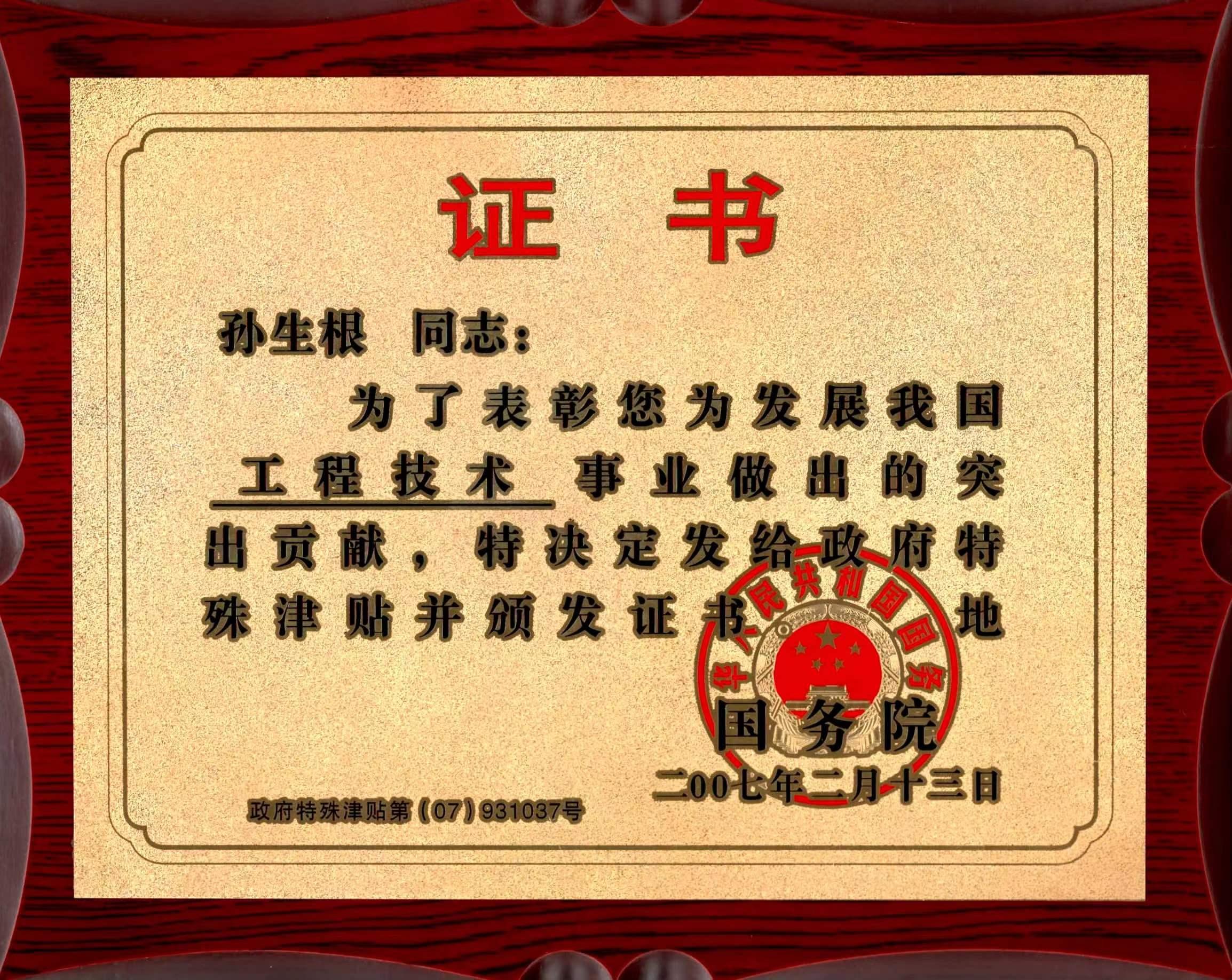 孙生根国务院证书