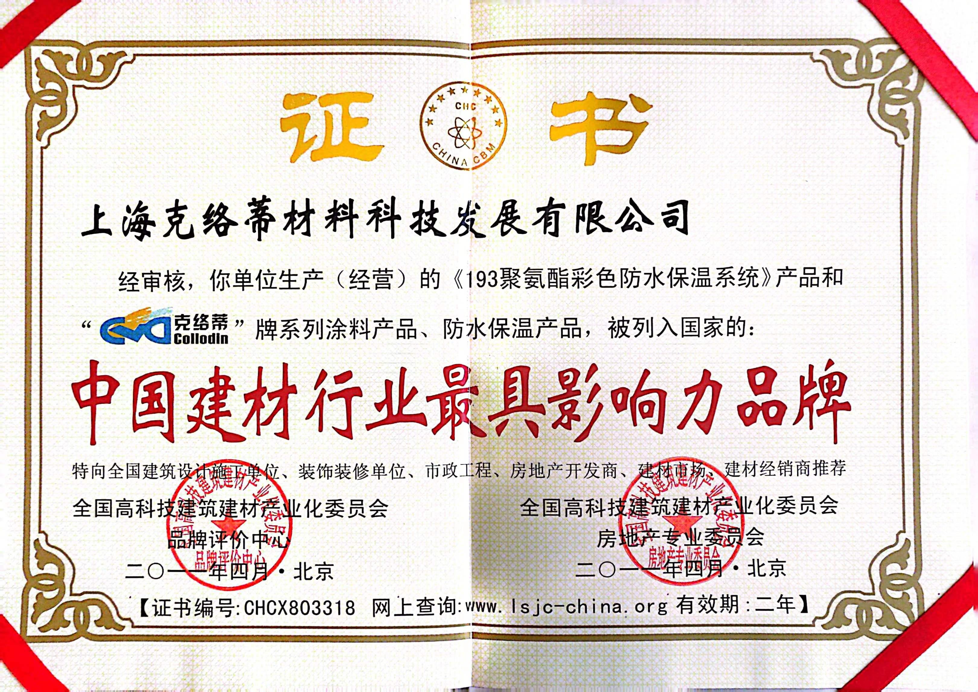 中国建材行业最具影响力品牌证书