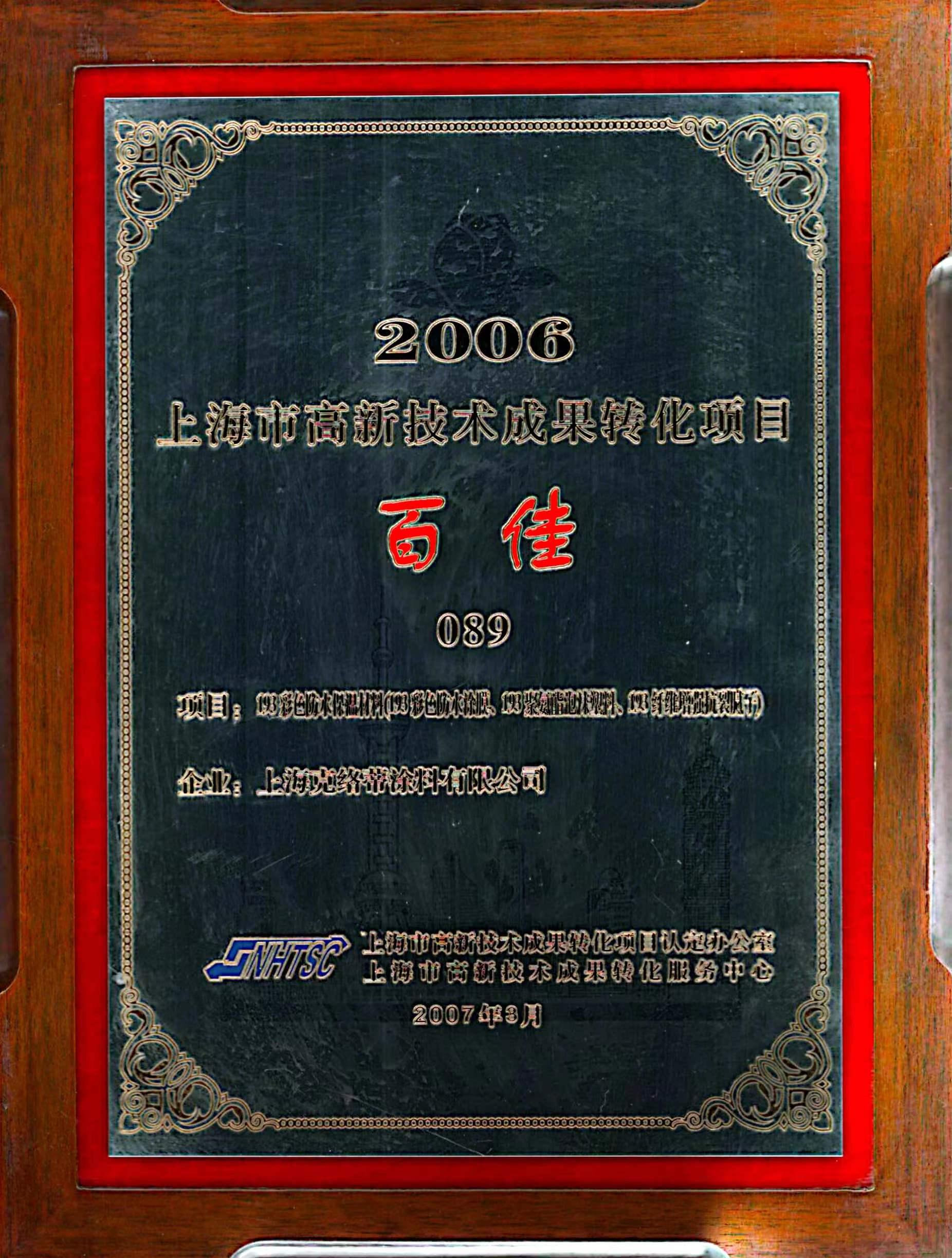 上海市高新技术成果转化项目百佳证书