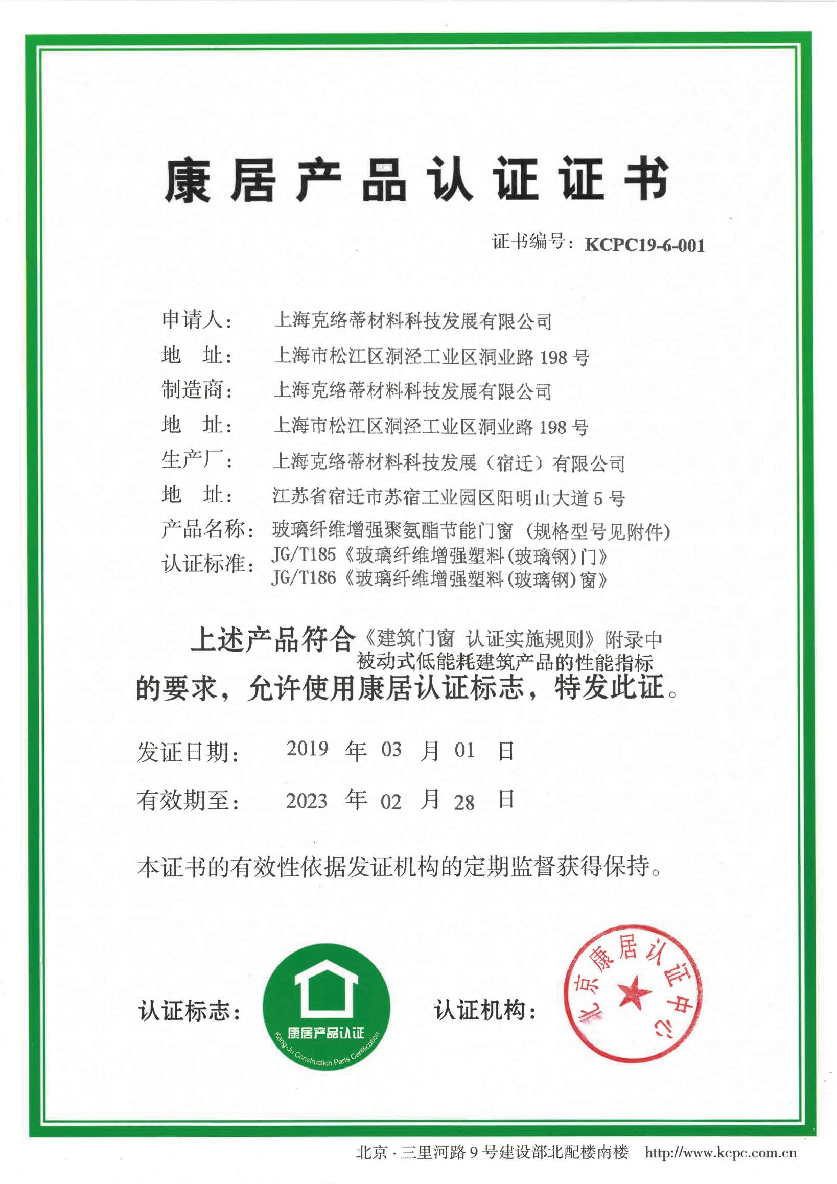 康居产品认证证书