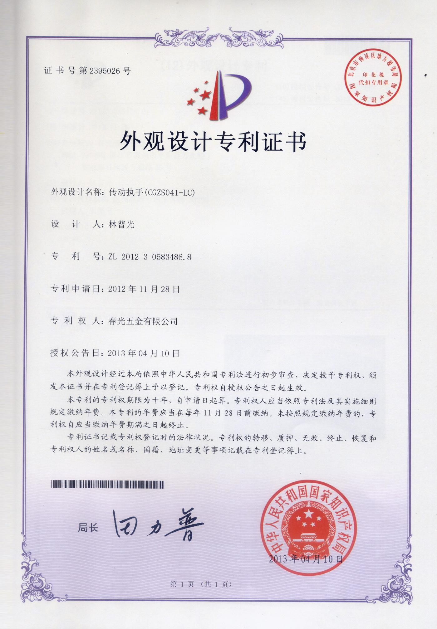 传动执手CGZS047-CD/CGZS043-LC外观设计专利证书 |