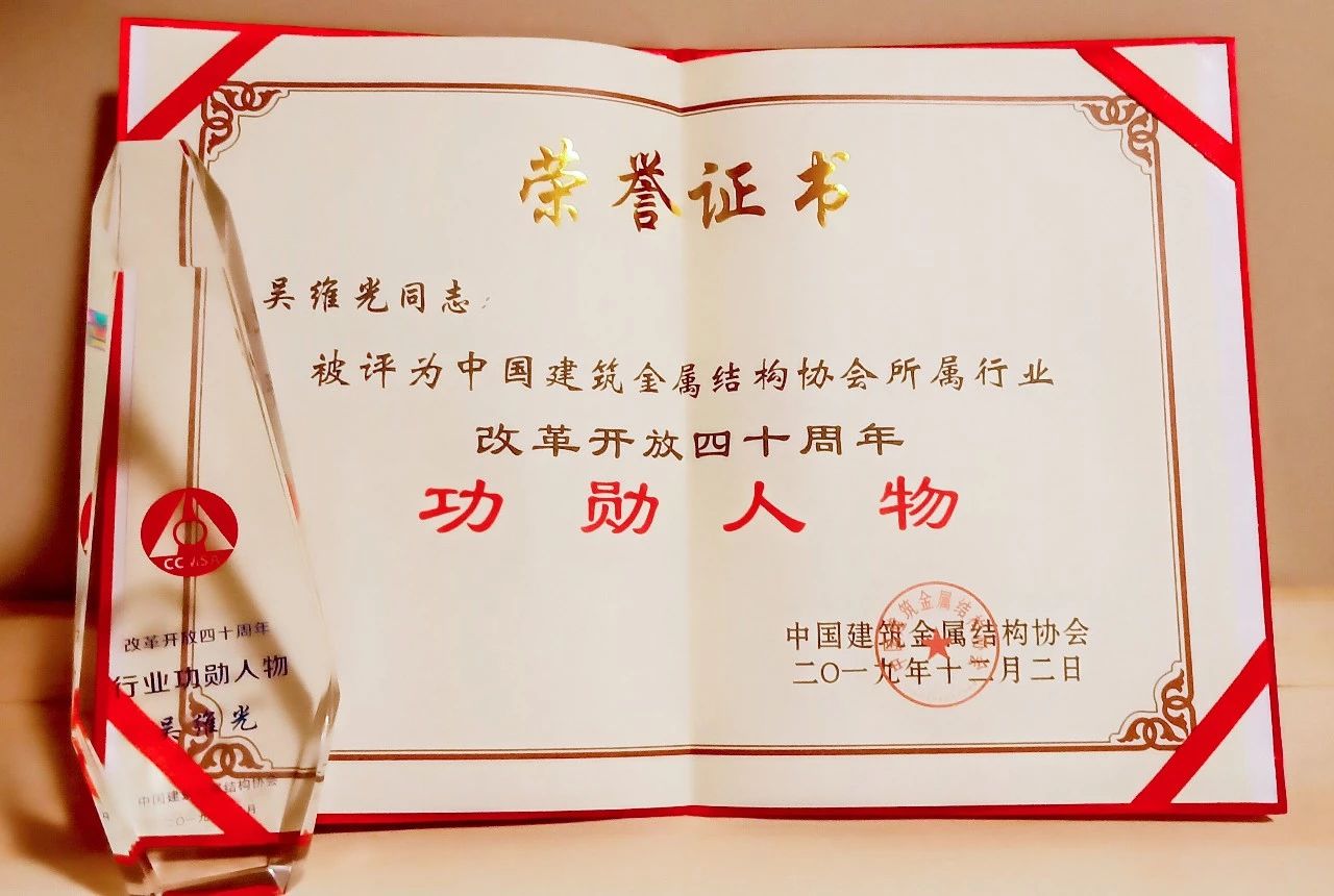 华建铝业集团董事长吴维光当选中国建筑金属结构协会第十一届理事会副会长,同时被授予“中国建筑金属结构协会所属行业改革开放四十周年‘功勋人物’”。