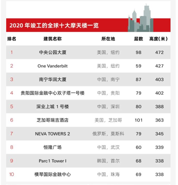 受新冠肺炎疫情冲击,2020年全球高层建筑在建造中陷入不同程度的影响,工程进展计划广受限制,甚至停止。据世界高层建筑与都市人居学会(CTBUH)发布的2020年度报告显示:2020年建成了106座200米及以上高度的建筑,这一数据与2019年的133座相比下降了20%,只接近2014年105座的水平。尽管在此情况下,2020年竣工的全球十大摩天楼,中国仍占有5座。特别引以为豪的是这5座中有4座使用了慧鱼的产品,慧鱼作为锚固行业佼佼者,高品质的锚固产品深受各方专家学者赞誉,在业内被称为“隐形冠军”。