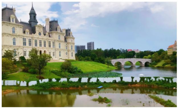 华为培训学院位于东莞市松山湖风景区南部,占地约487亩,总建筑面积约18万平方米。一期由一栋图书馆(地下1层/地上4层)、一栋教学楼(含3栋单体教学楼,地下最多2层/地上最多7层)及附属楼组成,目前已投入使用。