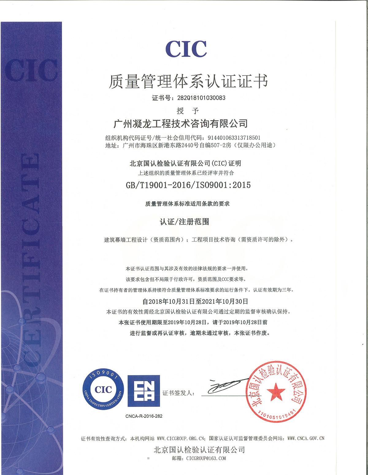 CIC 质量管理体系认证证书 |