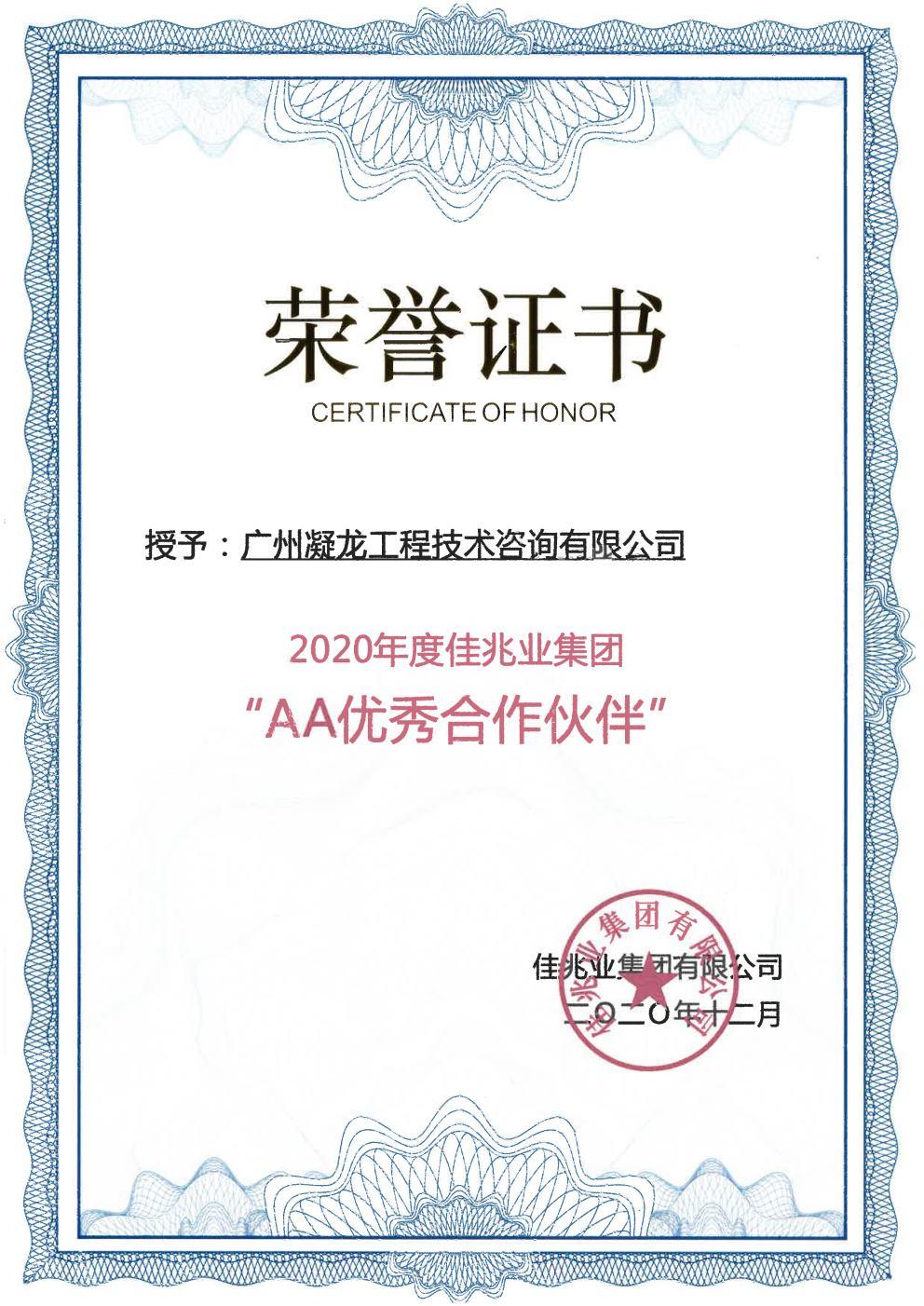 佳兆业2020年AA优秀合作伙伴 |