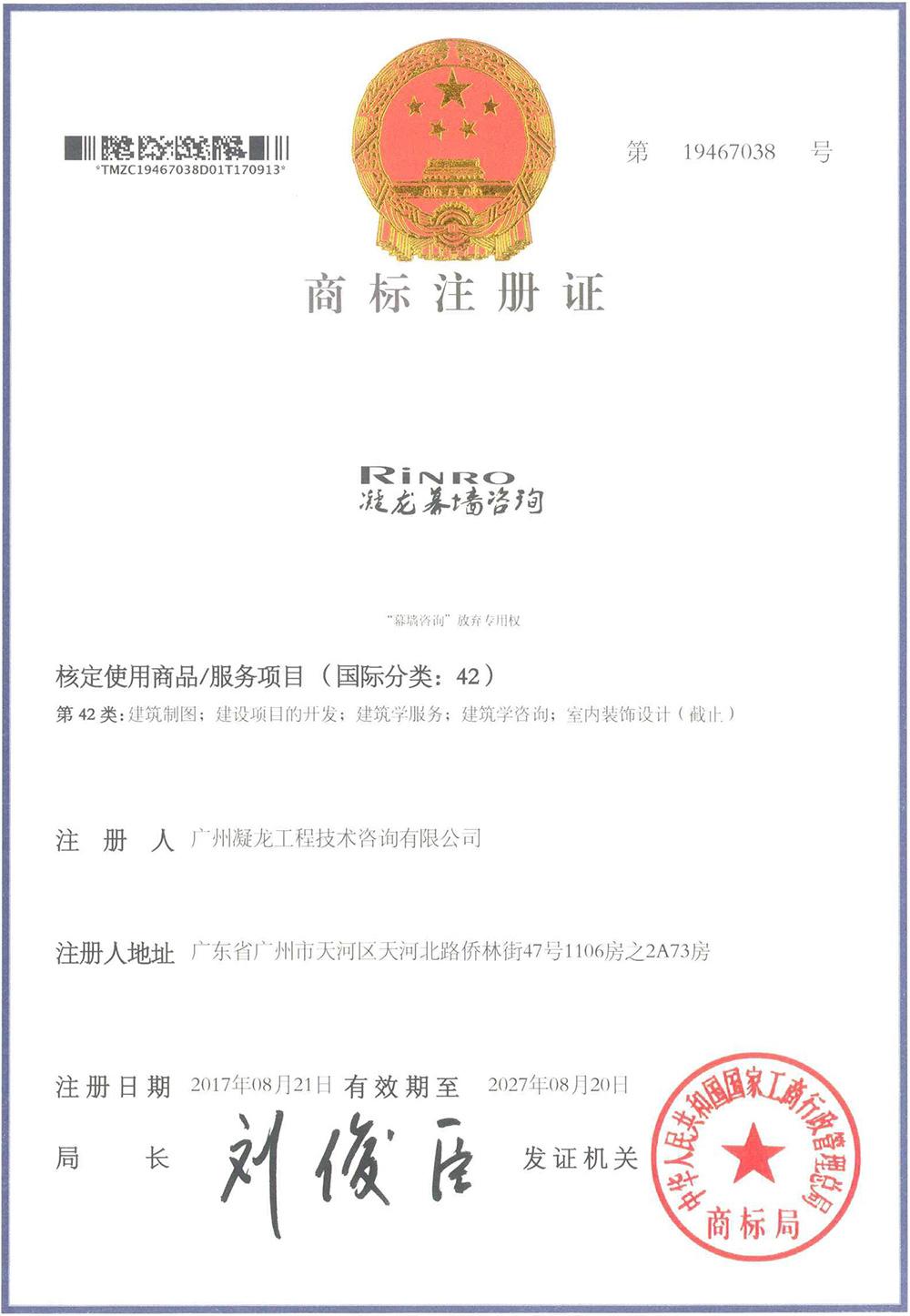 Rinro商标注册证书 |