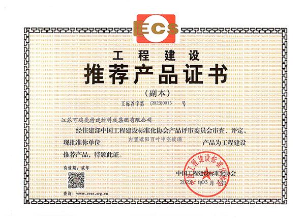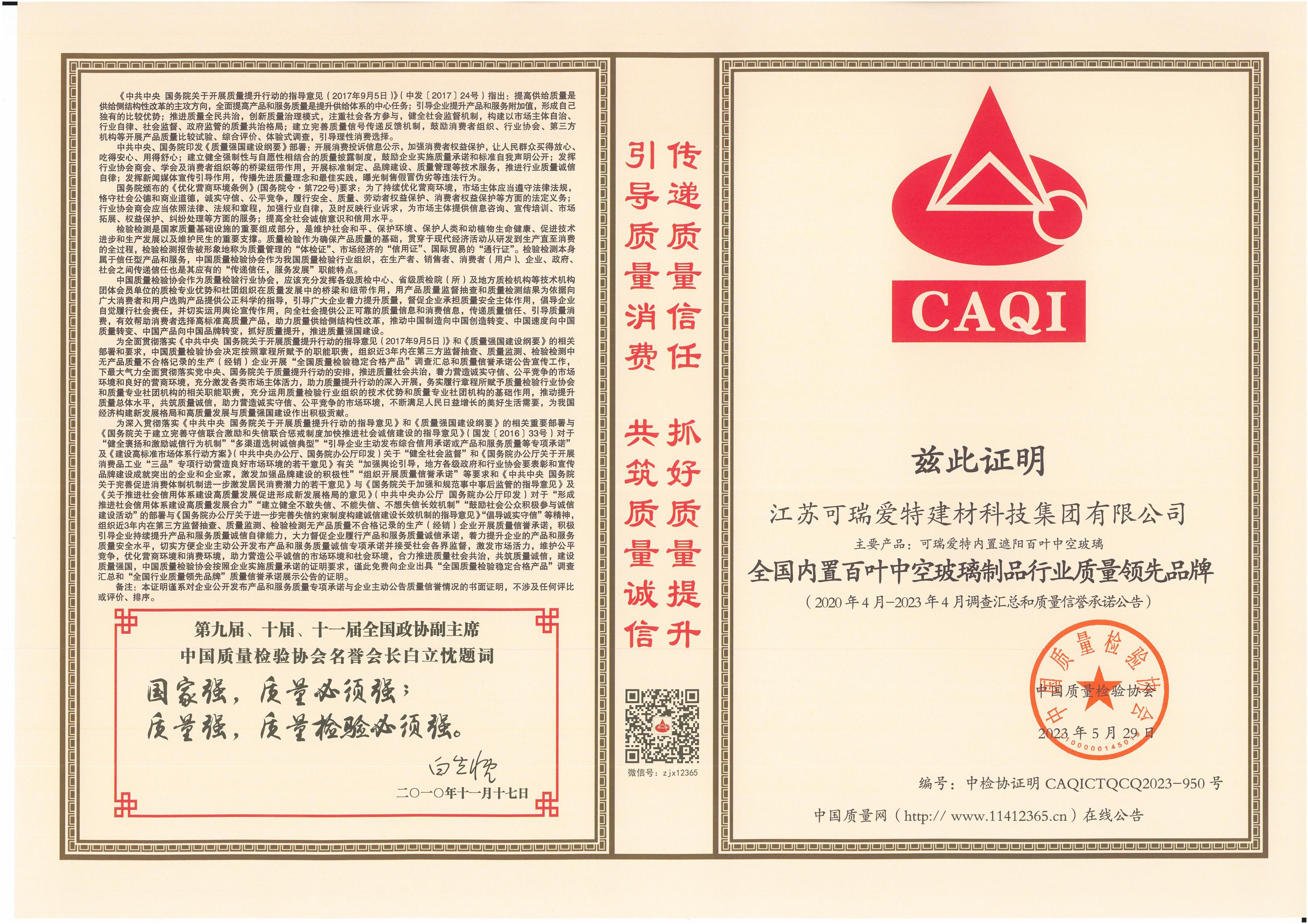 CAQI中国质量检验协会 “全国内置百叶中空玻璃制品行业质量领先品牌” |