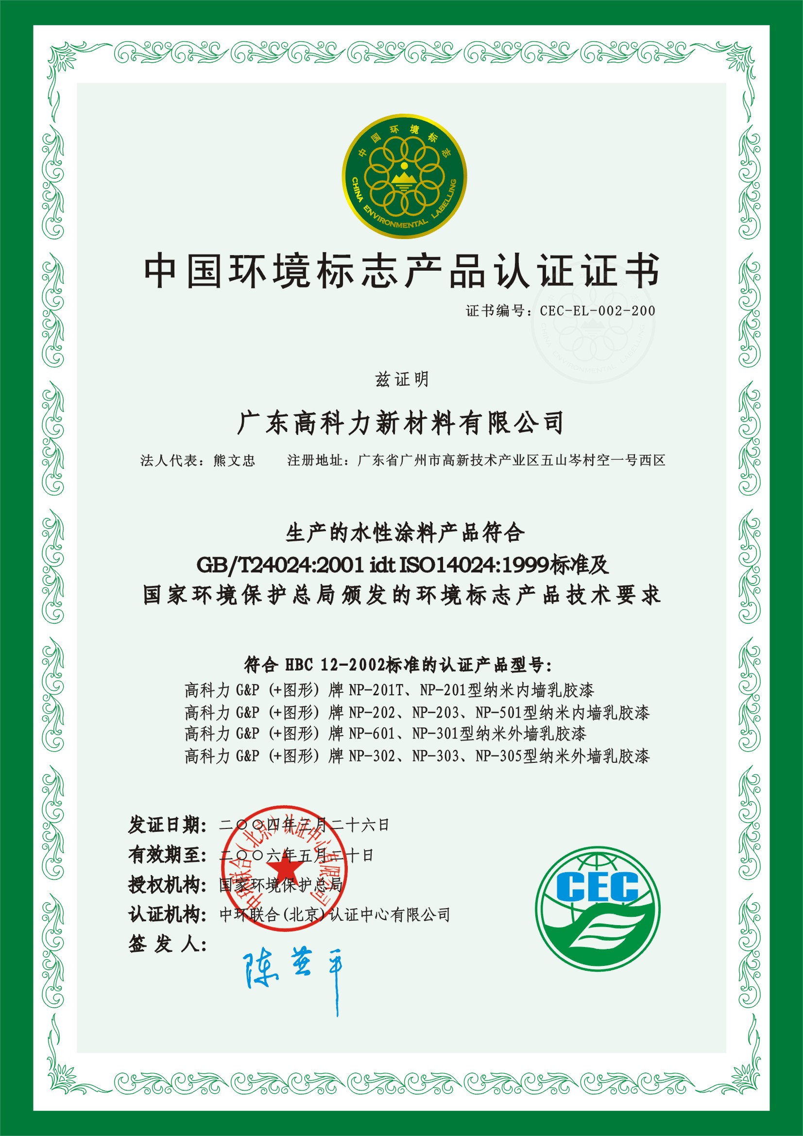 中国环境标志产品认证证书 |