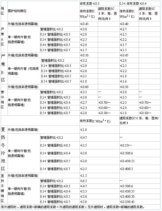 求围护结构传热系数和遮阳系数限值。