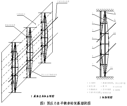 支承结构只传递水平荷载,解决了因主体建筑结构支承力不足而无法使用索桁架作为幕墙支承结构的问题,对主体建筑结构的支承力要求不高,增加了索桁架幕墙的适用范围。(如图2)