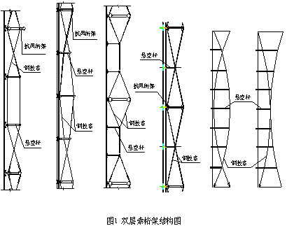 双层索体系是由一系列凸凹曲线(钢丝索)和他们之间的连系杆(悬空杆)所组成。双层索系的承重索、稳定索和联系杆一般都布置在同一