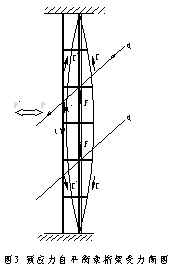 在墙壁受到正风压P的作用时,后受力索受拉力f;在受负风压P′时,前受力索受拉力f′;在幕墙自重T施加后,竖向承重索支承重力达到受力平衡;为提高自平衡索桁架平面内的刚度,必须在索内施加预应力才能抵抗外力p与p′的作用。由于预应力的施加,支撑杆产生压力F,达到内外力的平衡。q为自平衡索桁架平面外支承力。(如图3)