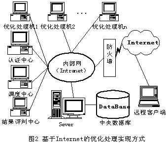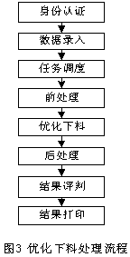 具体应用中用户首先通过权限认证后,在网页上输入下料相关数据和选择优化下料方式,并将数据提交到优化处理中心,优化处理中心根据任务情况,将任务分发给多台适合的优化处理机进行优化处理,处理结果反馈给优化结果评判中心,评判中心选出最优方案反馈给用户,用户通过从服务器上下载的打印软件将优化结果进行打印输出,并用于指导具体下料。处理流程如图3。