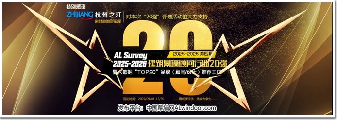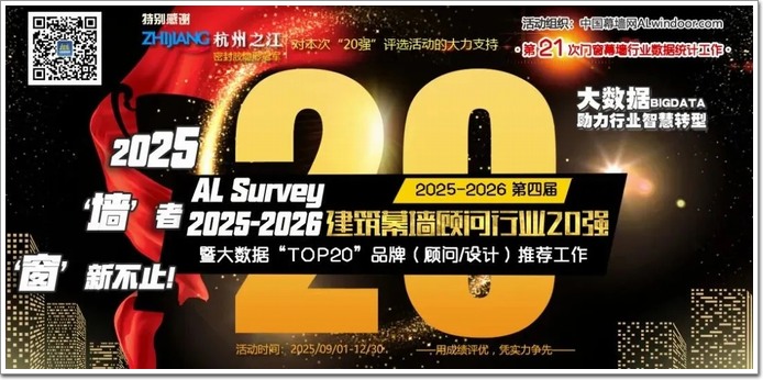 选优、评优、示优|本次评选活动以行业大数据统计工作为重要基础,配合行业推荐、业绩展播、技术展示、专家评审、网络投票等环节,由中国幕墙网ALwindoor.com组织开展的“2025-2026第四届建筑幕墙顾问行业20强”评测活动,在杭州之江“金鼠牌”高性能建筑胶的大力支持下,旨在更好的激发幕墙设计及顾问咨询创新活力,深化产业链上、下游之间的诚信体系建设、信息传播与品牌互动。