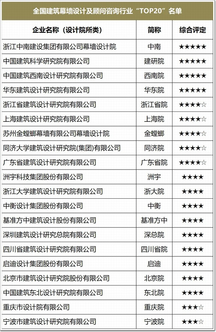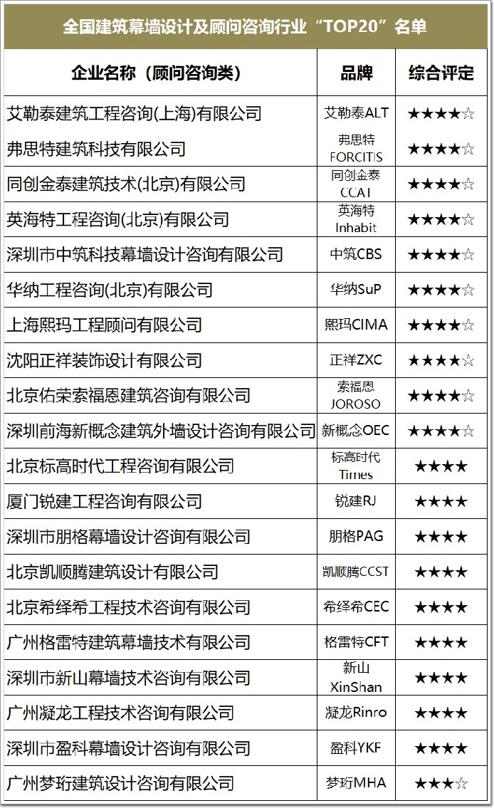 通过资料评分、专家复审和网络人气投票等三个环节,最终依据总体得分表现,选拔出年度最具实力和代表性的20家幕墙顾问咨询公司,以及20家幕墙设计院(所),现将评测结果进行发布。