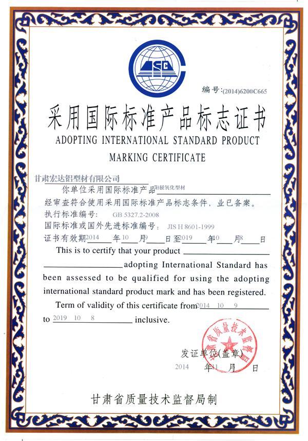 采用国际标准产品标志证书-粉末喷涂型材 |