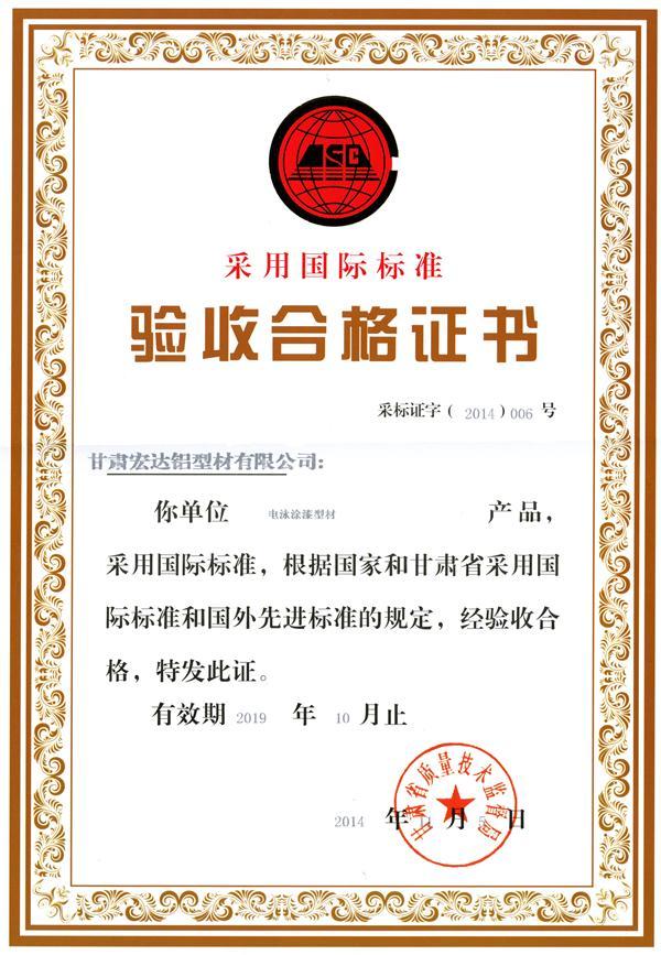 采用国际标准产品验收合格证书-电泳涂漆型材 |