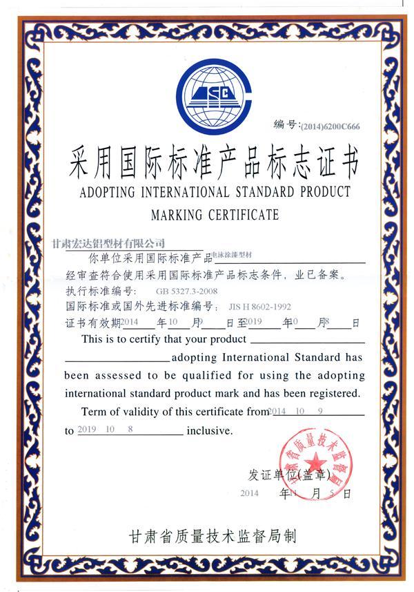 采用国际标准产品标志证书-电泳涂漆型材 |