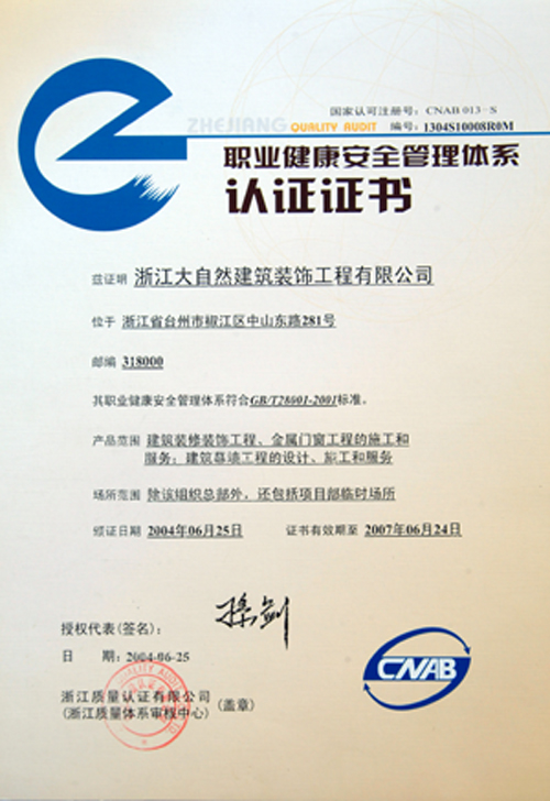 职业健康安全管理体系认证证书