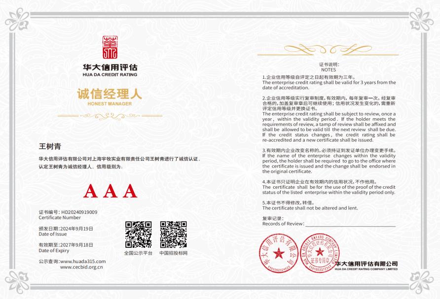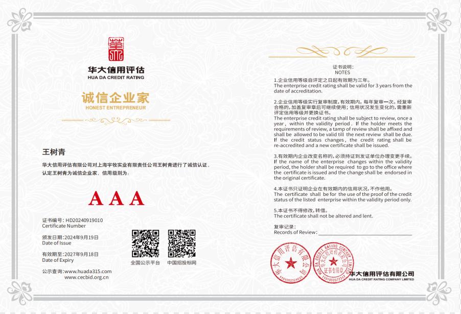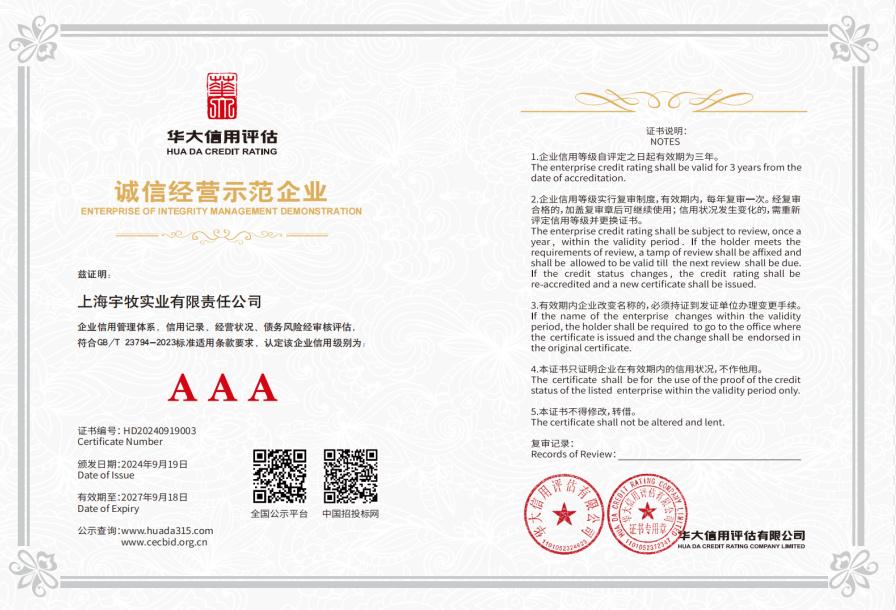 证书名称: 宇牧实业AAA级诚信经营示范企业证书