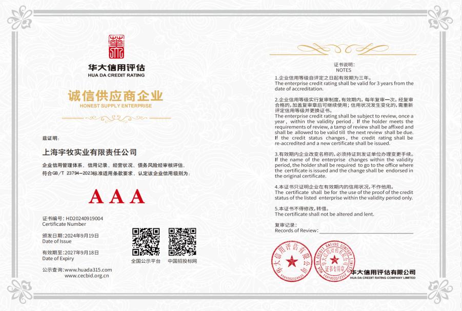 证书名称: 宇牧实业AAA级诚信供应商证书