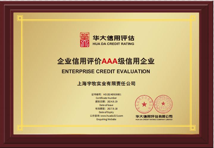 证书名称: 宇牧实业AAA级信用企业牌匾