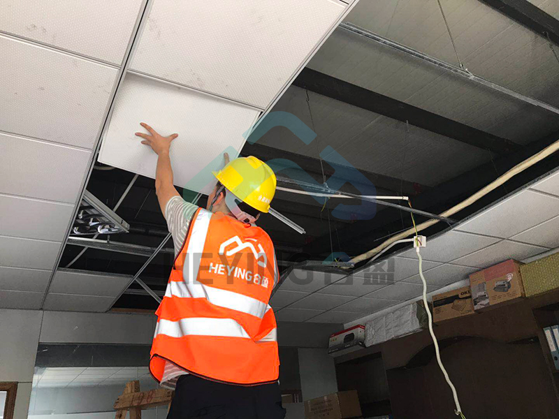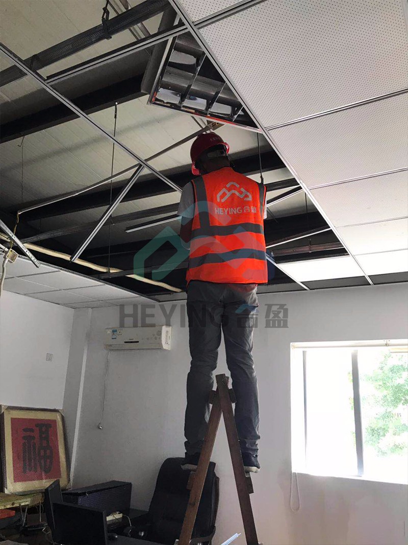由于台风危害原因,吊顶部分塌陷,影响企业正常工作,幸运的是,吊顶塌陷的时候没有造成人员伤害,合盈施工员陈工、李工正进行维修,希望尽快恢复业主企业正常运营。