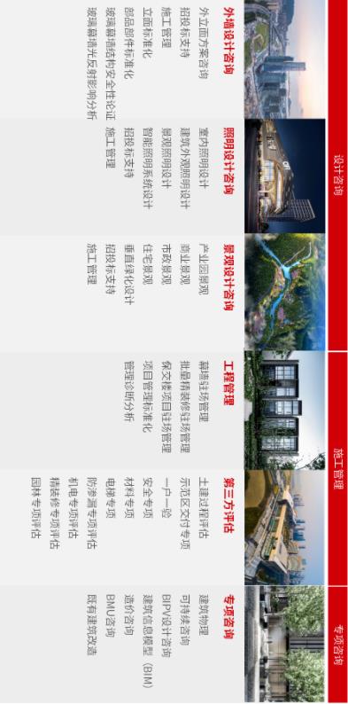 包含可持续咨询、BIPV设计咨询、 建筑物理、环境影响评估和认证、 建筑信息模型(BIM)等 我们将致力于把可持续策略 融合到企业的核心业务当中 实现更好的节能减碳目标 我们积极探索被动式技术 采用超低能耗幕墙系统 使围护结构有良好的保温隔热性能 我们积极探索低成本主动式技术 如BIPV选用高效光伏发电组件 为建筑供能 室内采用智能照明控制系统 我们积极探索国内外立体绿化的 发展路径和技术 从立体空间内寻求“双碳“可能 立面营造出垂直绿化生态环境