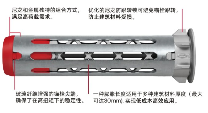 全新上市的慧鱼空腔锚栓DuoHM,采用了尼龙和金属独特的组合方式,兼具高强度与柔韧性,满足高荷载场景需求,一种膨胀长度适用于多种建筑材料厚度,实现"一栓多用"的安装革命。