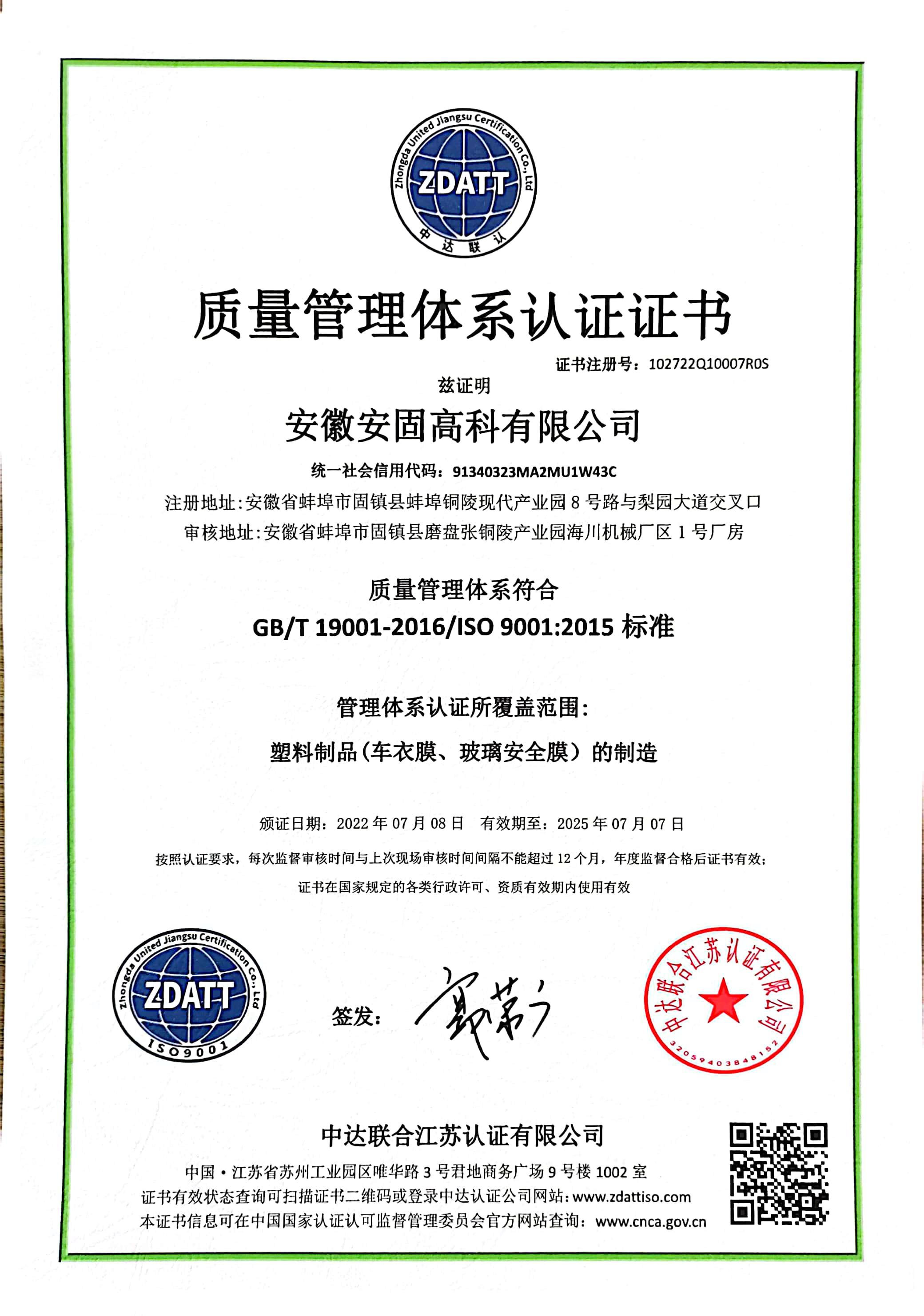 质量管理体系认证证书 |