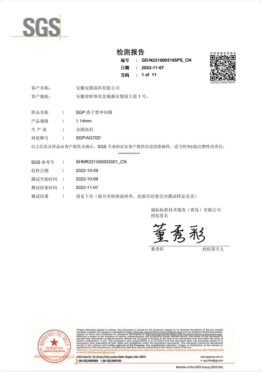 SGP离子型中间膜SGS报告 |