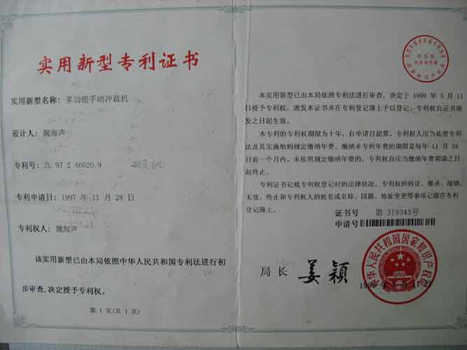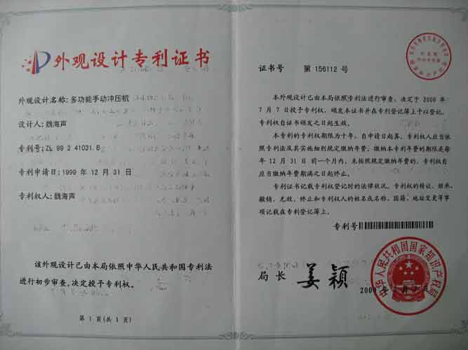 多功能手动冲压机外观设计专利证书 |