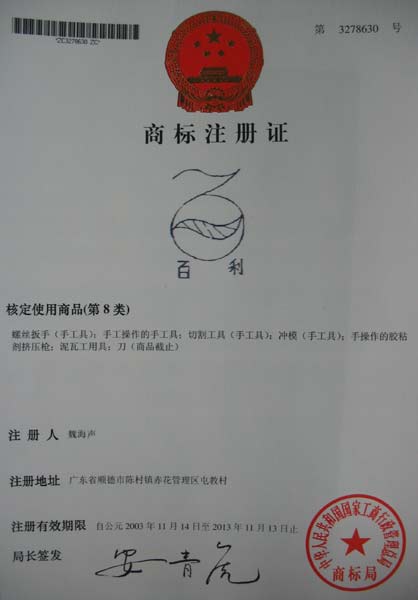 百利商标注册证 |