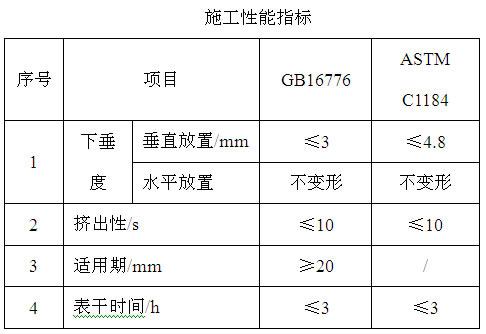 密封胶的施工性能表征了产品的使用性能,是施工应用的关键性指标,直接关系到施工操作时的便捷性。良好的施工性能,可以有效保证施工过程的速度及效率;而不良的施工性能不仅造成操作困难,也容易发生施工质量缺陷。在硅酮结构胶的施工性能指标方面,国标GB16776与美标ASTM C1184标准中,均对现场施工相关的流动性、挤出性、表干时间、适用期等性能指标进行了规定,评价要求基本一致,其中GB16776个别指标要求比ASTM C1184要相对严格,具体对比见下表。
