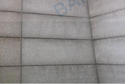 绝大多数幕墙面板上有“流痕”污染现象,即污染物在雨水作用下在幕墙面板上出现垂流污染,“流痕”在胶缝上下都可观察到,这就是垂流污染。与渗透污染的区别是:垂流污染是可以清洗的。垂流污染不仅出现在暴露户外的石材幕墙、铝板幕墙,在玻璃幕墙上也可观察到。在幕墙未进行清洗的前提下,垂流污染会随时间的延长,污染物的积聚而逐渐明显。一般使用环境下,我们发现有幕墙样板3个月左右就出现了垂流污染现象。垂流污染现象产生后,在浅色的石材和铝板幕墙表现尤为明显,对幕墙的整体美观影响较大。