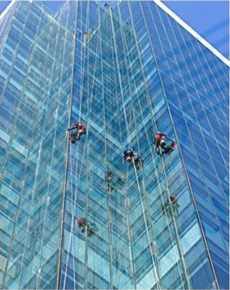 垂流污染可以通过幕墙表面清洗的方式予以清除,目前多数用户采取定期清洗方法保持幕墙的清洁美观;但是,清洗费时费力,尤其在高层和超高层幕墙上,幕墙板块清洗的难度较大,成本较高,且高空作业存在安全隐患,如图6。例如今年4月份的央视大楼“大裤衩”外幕墙清洗,媒体报道清洗费用达50万元,耗时40天。垂流污染清洗后,仅在一定时间内可维持幕墙的清洁美观,一定时间期限后需再次清洗。如遇到相对恶劣的天气,如北方的沙尘暴天气等,有可能污染很快再次出现而需要重新清洗。