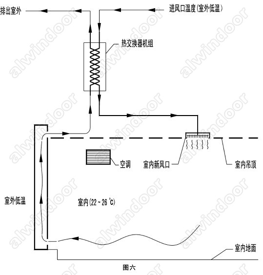 交换式内循环双层幕墙冬季寒冷时工作原理是室内气体经图示线路从双层幕墙进气口(下口)进人,经双层幕墙中间腔从幕墙上面出口经管道进入热交换机组,此时室内被排出的热空气与经外部进气口进入热交换机组的低温新风进行能量交换。在这个热交换过程中,室内被排出去的室温空气(比室外空气温度高)在经过热交换器的时候,把热量传给进来的低温新风,这样进入室内的新风的温度就升上来了。减少了冬季室内暖气或空调制热的负荷。