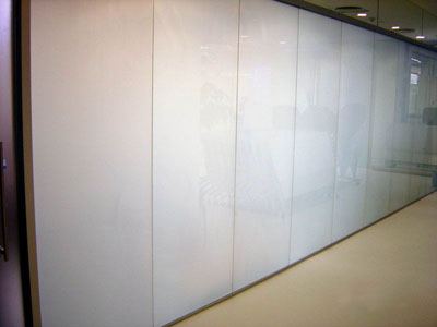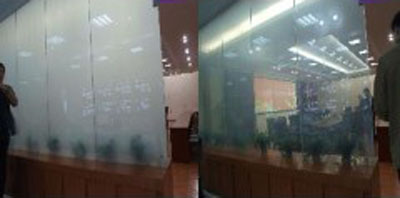 例2:会议室隔断。 即使是偌大的办公区,被数面墙体或磨砂玻璃隔断也会显得狭小憋闷,全部采用通透玻璃设计又缺乏商务保密性,这时您的确需要一种可以调节透明光度的玻璃材具解决烦恼,会议室空闲时,可调节为全光照透明状态,进行商务谈判时,只要轻轻一动,则可让整个谈判区从周围目光中彻底模糊掉。