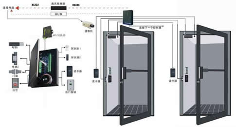 四门双向控制器:比四门单向控制器多出一个功能,区别是进门还是出门。 多功能控制器:可以根据具体要求在1门双向和2门单向这两个功能间转换。比较灵活。 选择控制器一定要根据实际情况。门区之间的距离。布线的复杂程度。控制电脑的所在位置。要实现的具体功能都是选择门禁控制器的必要条件。 门禁系统可以达到的功能. 随着技术的不断提高。门禁系统所能达成的功能也越来越多。除了最基本的权限管理。实时监控。记录查询。异常报警。消防联动。防潜回功能外。还有: 权限分级功能:此功能是针对门禁系统的管理者而设定的。可以将管理员按权限分为几个段。每人负责一段。这样可以明确责任,使管理更加透明,并且责任到人。 网络设置管理监控功能:大多数门禁系统只能用一台微机管理,而技术先进的系统则可以在网络上任何一个授权的位置对整个系统进行设置监控查询管理,也可以通过互联网进行异地设置管理监控查询。 逻辑开门功能:就是同一个门需要几个人同时刷卡(或按一定顺序刷卡)才能打开电控门锁。 首卡开门功能:设定一张卡为首卡,那么只有当首卡刷卡开门之后,其他的授权卡才能刷卡开门。只要首卡不刷。那么其他的卡也没法打开门。也可以设定首卡锁门,只不过首卡刷卡之后门就会锁死,直到首卡再次刷卡。 时间段开关门功能:设定开关门时间段,在开门时间段内。刷卡可以开门。在开门时间段外。则刷卡也不开门。而且还可以设定特权卡。可以在任意时间刷卡开门。 双门互锁功能:最高安全等级的防潜回功能,在通道里安装两道相邻的门。双门互锁原理图