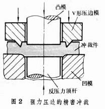 概述 冲 裁是利用冲模使部分材料或工序件与另一部分材料、工(序)件或废料分离的一种冲压工序。冲裁是剪切、落料、冲孔、冲缺、冲槽、剖切、凿切、切边、切舌、切开、整修等分离工序的总称。 从板料上分离出所需形状和尺寸的零件或毛坯的冲压方法。冲裁是利用冲模的刃口使板料沿一定的轮廓线产生剪切变形并分离。冲裁在冲压生产中所占的比例最大。在冲裁过程中,除剪切轮廓线附近的金属外,板料本身并不产生塑性变形,所以由平板冲裁加工的零件仍然是一平面形状。 主要工序 冲裁可分为剪切、落料、冲孔、切断、切口和剖切等。①剪切是将大平板剪切成条料。②落料是沿一条封闭的分离线将所需的部分从板料上分离出来。③切边是切去拉深件的飞边。④冲孔是在板料上冲出孔、槽和百叶窗等。 应用 冲裁除作为备料外,常用于直接加工垫圈、自行车链轮、仪表齿轮、凸轮、拨叉、仪表面板,以及电机、电器上的硅钢片、集成电路中的插接件等。 间隙 冲裁模的上、下模刃口的错开量称为间隙。间隙对剪切变形、破坏过程、冲裁件的质量、冲模寿命有影响。冲裁间隙受板料的性能、板料厚度、冲裁方式和冲模结构等多种因素影响,一般单边间隙取板厚的10~15%。 冲裁切口 冲裁后得到的冲裁切口表面由塌角、剪切面、断裂面和毛刺等4部分组成。剪切面是塑性变形形成的,表面光洁且与板料平面垂直。断裂面是破坏形成的粗糙表面,不垂直于板料平面,呈一定倾角。普通冲裁件的尺寸精度低于5级,表面粗糙度约为Rα50~10。 精密冲裁方法 采用精密冲裁方法可以提高冲裁切口表面的质量,得到全部光洁和垂直的剪切面。精密冲裁的实质是使冲模刃口附近剪刀变形区内材料处于三向压应力状态,抑制断裂的发生,使材料以塑性变形的方式实现分离。为此在冲裁的外周增加强压力圈,如图2中的V形压边膜,冲模间隙减小或为负间隙(凸模小于凹模)。 在批量较小时,或冲裁厚度很小的薄板工件时,常用橡胶或聚氨酯代替冲裁模的一个刃口,用另一个刃口完成分离工作。这种方法称为橡胶冲裁或聚氨酯冲裁。 其他补充 |